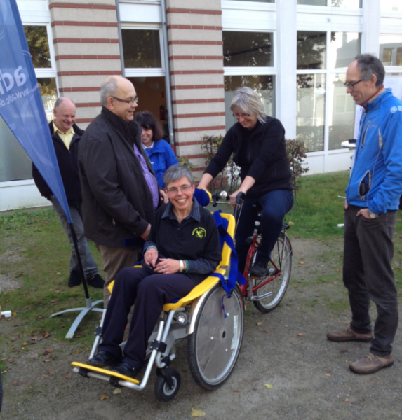 Kann ich alleine wohnen? Wer hilft mir bei der Organisation der Wohnungssuche, beim Umzug? Wie finanziere ich eine Wohnung oder ein Zimmer in einer Wohngemeinschaft? Anläßlich der 10-Jahres-Feier fand in den Räumlichkeiten des DPWV im Wiedenhof eine Freizeitbörse statt. Die Theatergruppe der Lebenshilfe präsentierte Ihr neues Stück. Interesse fand auch die Vorstellung des Rollfiets des ADFC. Denn Freizeitgestaltung braucht Mobilität! Petra Freining, Behindertenbeauftragte der SPD und Gundula von Nell, Geschäftsführerin der Dr. Ulrich-Lange-Stiftung lassen sich die Funktionsweise erklären und starten zu einer Probefahrt.