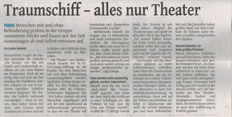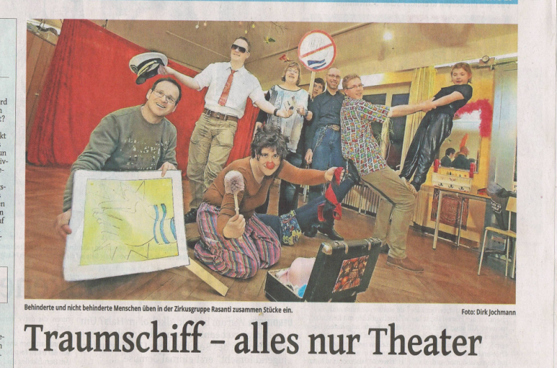 Für die Gruppe wurde das Wochenende zu einem vollen Erfolg. Für Olaf Jansen stimmte die Chemie zwischen B. Zühlke und den Teilnehmern. „Jeder von uns hat neue Impulse für seine persönliche Entwicklung bekommen.“ Für Katrin Soer, (Co-Leiterin der Gruppe)war die Einführung der „Figuration Mimeè“ etwas völlig neues. Figuration bedeutet hier Alltagssituationen und einfache Handlungen unter Einsatz des ganzen Körpers, oder mit Teilen des selbigen (Hand, Fuß, Kopf, Schulter, Arm) darzustellen. Katrin Soer: “Wir wurden dadurch in relativ kurzer Zeit befähigt, kreative, witzige und kleine Szenen zu entwickeln. Das Schöne war, alle Teilnehmer waren beteiligt.“ Yannic Niehr : Wäre der Spaßfaktor der Indikator für den Wellengang unseres ALIDA-Traumschiff gewesen, wären wir wohl in Seenot geraten Besonders dankbar waren die Teilnehmer der ,,AKTION MENSCH,, die das ganze Projekt erst möglich machte. Die RASANTI’s haben jetzt nur noch ein Ziel, sie möchten sich im Kulturleben der Stadt Krefeld und über deren Grenzen hinaus als professionelle Theatergruppe etablieren.